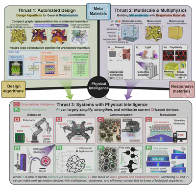 We will combine our expertise in Metamaterials (nonlinear waves, phase transitions, soft robotics), Responsive Materials, and Design Algorithms to develop next-geneartion materials, device, and robots with Physical Intelligence.